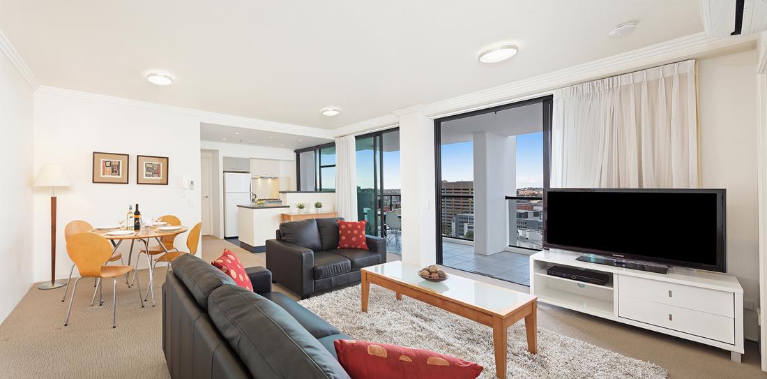 Serviced Apartment facilities: All short term apartments have a large ensuite with shower/bath, 32″ LCD TV with free 85-channel Foxtel & DVD player, direct dial phones, air-conditioning/heating and fans, a large balcony with city views, bedside radio / alarm clock, tea/coffee making facilities, hairdryer, full kitchen set-up including a refrigerator, microwave and a dishwasher etc. The separate laundry includes a washing machine, dryer & ironing facilities etc.